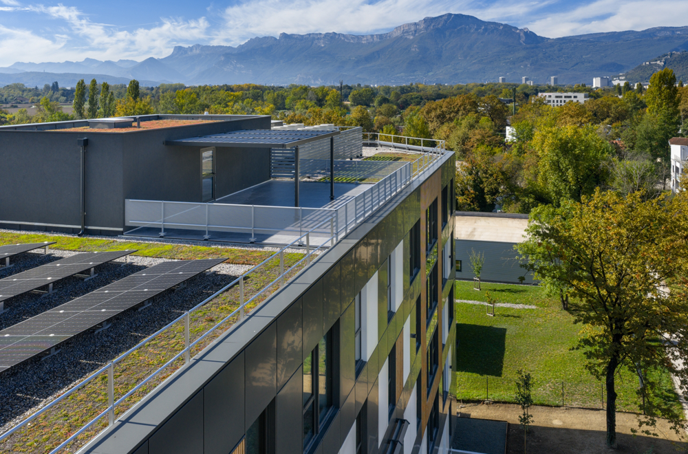Un bâtiment basse consommation, équipé de panneaux photovoltaïques et doté d’une toiture végétalisée.